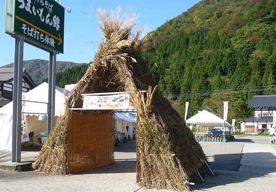 紅葉の山道を通って、利賀村坂上の「そばの郷広場」に着くと、茅(かや)をあしらった合掌型のゲートがお出迎え。